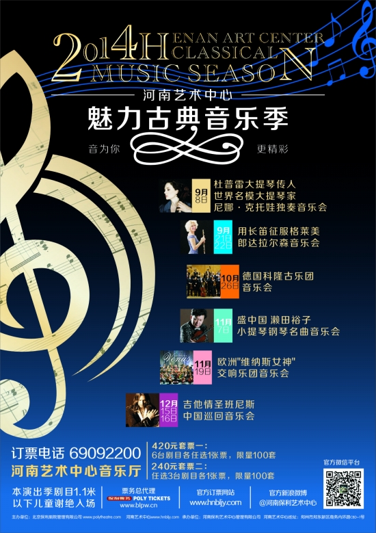 10月26日,德國科隆古樂團將演出《德國科隆古樂團音樂會》。德國科隆古樂團成立于1985年,這是世界上獨一無二的一支以演奏18到19世紀早期古典音樂精品的樂團。音樂評論界稱之為經典、激情、即興和挑釁的代表。11月7日,中國小提琴演奏藝術的代表人物之一、中國小提琴學會會長盛中國將來到鄭州舉行音樂會,音樂會上的曲目多為膾炙人口的中國民歌,如《康定情歌》、《山丹丹開花紅艷艷》等,河南觀眾將欣賞到一場極具中國特色的小提琴古典音樂會。11月9日,一場視聽盛宴《歐洲“維納斯女神”交響樂團音樂會》將奏響河南藝術中心,參加演出的是整個歐洲乃至全球唯一一個全部由女子組成的古典交響樂團,演出當晚,樂團所有成員將身著高貴、典雅的晚禮服,與世界著名古典樂曲交相輝映,為觀眾帶來“時尚”與“古典”的激情碰撞。12月15日、16日,從街頭藝人到世界巨匠的艾美獎獲得者班尼斯,將在鄭州上演《吉他情圣班尼斯中國巡回音樂會》。
