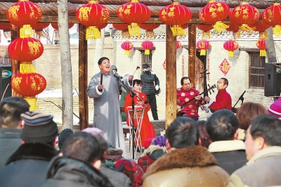 而在蘭考縣東壩頭鄉(xiāng)張莊村,精彩演出也逐一上演?!拔搴暮庀笕f千,神州大地萬民歡,同心同德奔小康,十九大精神天下傳……”河南民間藝人白金山自編自演的墜子小段《十九大精神傳天下》引來觀眾陣陣掌聲。在這里,書法名家們現(xiàn)場揮毫潑墨,寫出一個個喜慶的“?!薄皦邸弊郑瑢懴乱桓备憋柡85拇郝?lián);村民們喜滋滋地拍著全家福;舞蹈家們忙著“教你一招”,教大家跳舞……濃濃的年味兒撲面而來。張莊村村民劉大娘說:“今天俺看了演出、照了全家福,還拿到書法家寫的春聯(lián)。這個活動真辦到俺農(nóng)民的心里了。”