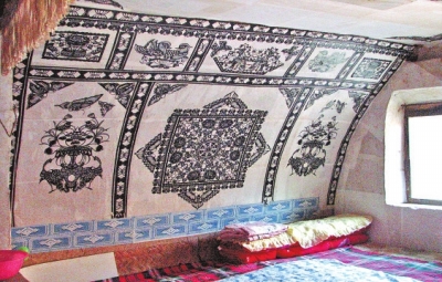 黑色剪紙中,最奇特的是黑色洞房剪紙。任孟倉將他的三口閑置窯洞,貼滿全套黑色洞房剪紙,屋頂大團花配四邊角花,土炕弧形內壁上,貼著全套墻圍花,這些剪花包括“囍”字,全是黑色的,有沉潛端方的美。任孟倉說:“新娘子紅衣綠褲子紅鞋,坐在黑色洞房里,就是不讓花里胡哨的。”