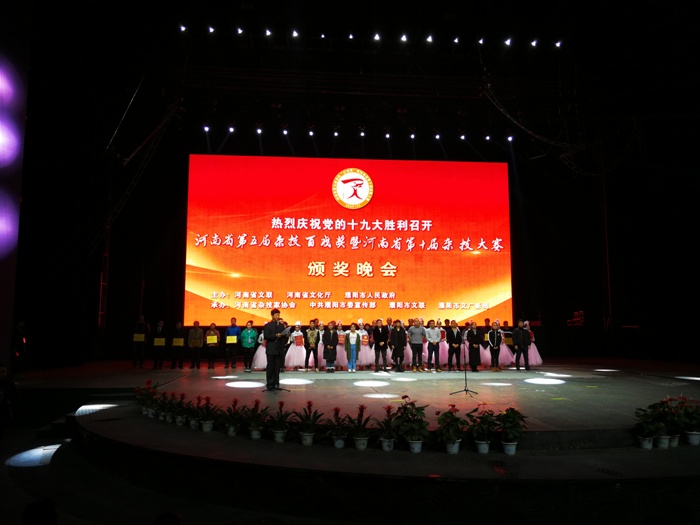 河南省第五屆雜技“百戲獎”暨河南省第十屆雜技大賽由省文聯、省文化廳、濮陽市人民政府主辦,省雜技家協會、濮陽市委宣傳部、濮陽市文聯、濮陽市文廣新局共同承辦。本次大賽分高空節目和地面節目,分別在濮陽市水秀國際大劇院和濮陽市工人文化宮舉行。這次比賽在創作和表演上都有重大突破和創新,參賽節目表現形式新穎,藝術技巧精美,動作難度較大,科技含量較高,綜合藝術手段運用表現出色,具有較高的藝術性和觀賞性,體現了我省雜技藝術發展的豐碩成果。在大賽監審組和公證員的見證下,大賽評審組嚴格遵照公正、公平、公開的原則,評選出金獎節目12個、銀獎節目13個、特別獎節目2個、創新獎節目1個,單項獎13個,此外,還評出組織獎22個。大賽達到了展示成果,檢閱隊伍,凝聚人心,振奮精神,豐富群眾精神文化生活的預期目的。
