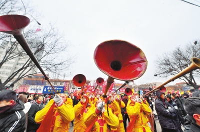 晨色熹微,浚縣古城內(nèi),各社區(qū)(村)的喇叭聲此起彼伏,聲聲催促著演員們。7點(diǎn),社火隊(duì)高擎起如林的彩旗,擂動(dòng)著動(dòng)魄的大鼓,吹響了長(zhǎng)長(zhǎng)的號(hào)角。盡管寒風(fēng)撲面,火熱的氣氛卻彌散在大街小巷的每一個(gè)角落。