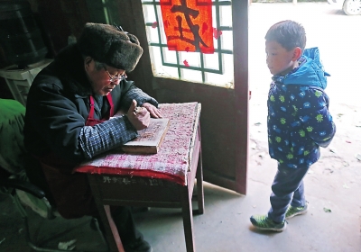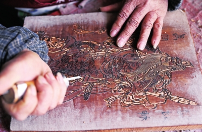 “木版年畫的版是由梨木刻的,先用水泡,再打底,將畫印上去,再用刀一刀一刀刻出來。一會兒白院長回來,讓他說,他年輕。”老爺子說完,就坐在門口的桌子邊,開始一刀一刀雕刻一個半成品。“看,這關公的胡子最不好刻,還要圓滑,還要一刀下來,刻這一個版大概需要十幾天。”見記者要為他拍照,老爺子堅持把帽子摘下來,說這樣拍好看。