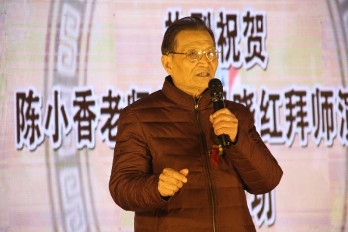 年逾80歲高齡的戲曲名家朱超倫為陳小香收徒儀式見證,登臺致辭。他稱之所以能在梨園春舞臺上點評常派唱腔時不外行,得益于陳小香編著的常派聲腔理論書籍。