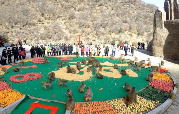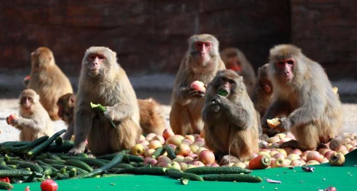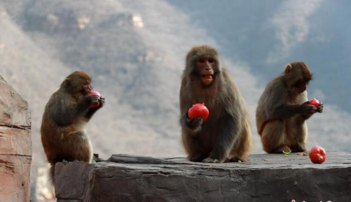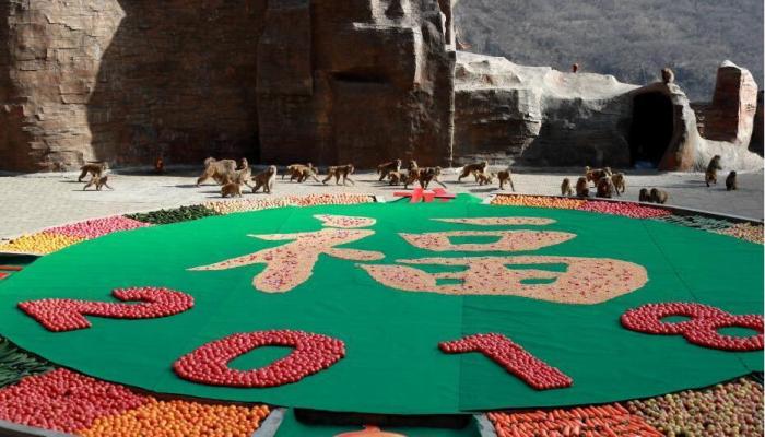 “美猴王”跨年派對享盛宴 猴群忙得不亦樂乎 (圖) 來源:中新社 作者:王中舉 ?攝 編輯人:荊書劍 發(fā)布時間:2018-01-03 2017年12月31日,中國猴山——河南濟源五龍口太行山獼猴自然保護區(qū),為太行山的野生獼猴舉行了一場別開生面的跨年派對,現(xiàn)場直徑12米的超級“餐桌”上的“福”字和“2018”奪人眼球,原來它們都是由猴子喜愛的“果蔬雜糧”拼成。蘋果、橘子、胡蘿卜、黃瓜、花生、玉米、水果糖可謂琳瑯滿目、色香味俱全,引得野生獼猴“呼朋喚友”。猴王一呼百應,漫山遍野的獼猴們蜂擁而至,看到滿眼的美食,邊吃邊拿,丟這撿那,忙得不亦樂乎,簡直幸福感爆棚!