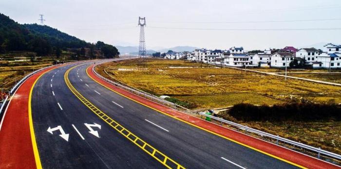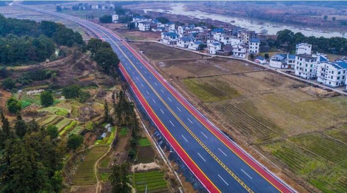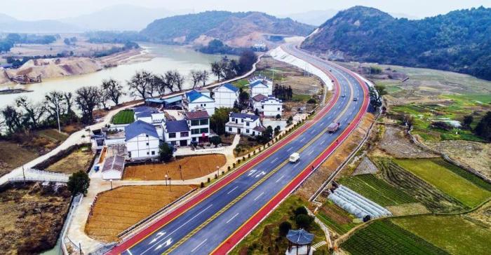 航拍江西鉛山首條彩色公路 穿行秀美鄉村 (組圖) 來源:中新社 作者:丁銘華 攝 編輯人:荊書劍 發布時間:2018-01-03 1月1日,航拍即將建成通車的江西省上饒市鉛山縣河永快速通道(河口至永平),該快速通道是鉛山首條彩色公路,宛如彩帶穿行于秀美鄉村之間。