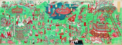 1941年春末,張大千來到甘肅敦煌莫高窟。他率門人子侄,用兩年時間對莫高窟壁畫進行了歷史上第一次大規模臨摹工作。兩年不辭辛勞的臨摹使得他對畫中“吳帶當風,曹衣出水”的風韻有了深刻領悟,并將其吸收到自己的創作中。