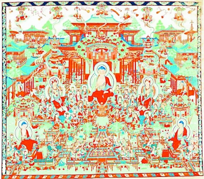 “我父親總結過敦煌壁畫臨摹的三種方法——客觀臨摹、整理臨摹和復原臨摹。張大千先生用的就是復原臨摹。他有一種觀念,就是現在看到的壁畫上是黑的區域,實際上是氧化了,原來肯定是紅的,所以,他的臨摹作品大部分都是紅的或綠的,這樣的色調成了張大千先生特色的復原臨摹。我也用張大千先生的方法去臨摹過一些壁畫,最后得到的畫很鮮艷。后來,我們認為應該要對壁畫色調進行分析,哪些是氧化了的。原來是大紅的,我們要把它畫成紅的;有的是水紅,又變了顏色。張大千先生的臨摹成果和特色,后來成為臨摹壁畫很重要的參考。”常沙娜女士說,“現在,張大千先生的臨摹品已經成了他的一個特色。離開敦煌以后,他又創作了許多新的作品,也按照敦煌的風格來改進他的人物繪畫作品——勾線開臉,表現得特別精細。”