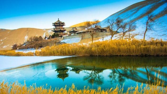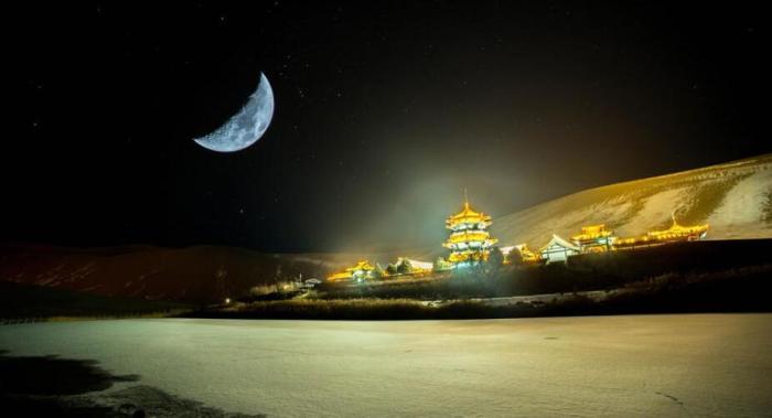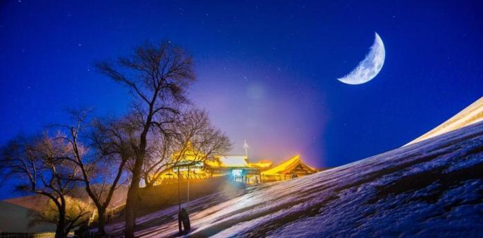 甘肅敦煌月牙泉晝夜雪景盡呈大漠“冬趣” (圖) 作者:王斌銀 攝 編輯人:荊書劍 發(fā)布時間:2018-01-29 幾天前,甘肅敦煌大漠迎來新年首場降雪,隨著近日積雪逐漸消融,當(dāng)?shù)刂镍Q沙山月牙泉景區(qū)呈現(xiàn)出如夢似幻的大漠雪景。夜幕降臨,一彎如鉤弦月懸掛在月牙泉上空,給敦煌大漠增添了夢幻迷人的大漠“冬趣”。圖為1月24日,“沙雪交融”的迷人月牙泉。