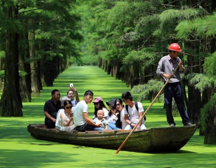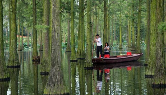 武漢“水上森林”成網(wǎng)紅地 吸引游客盛夏“打卡” (圖) 來源:視覺中國(guó) 編輯人:荊書劍 發(fā)布時(shí)間:2018-06-26 6月25日消息,游人在武漢漲渡湖濕地“水上森林”泛舟觀鳥。入夏以來,位于湖北省武漢市新洲區(qū)的漲渡湖濕地,萬余棵池杉整齊地栽種在1米深的水中,人、鳥、林、水和諧相融的獨(dú)特“水上森林”奇觀吸引大量游客尋訪觀光。