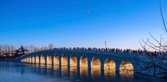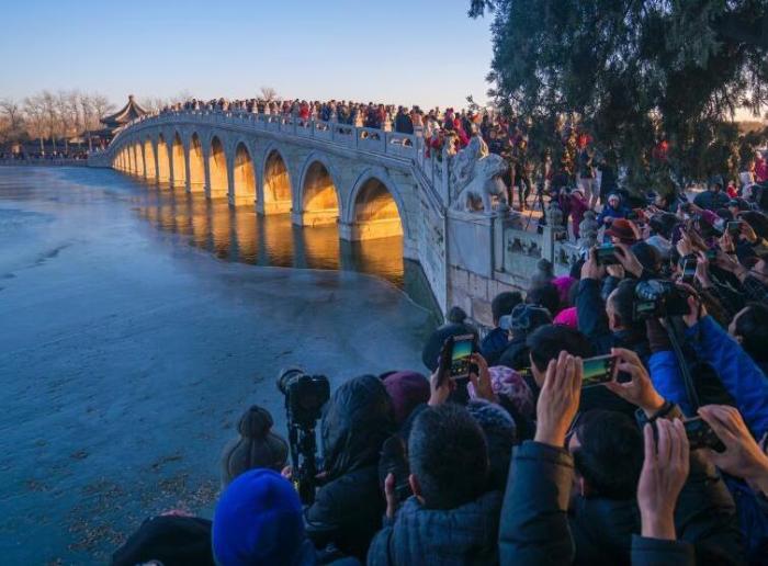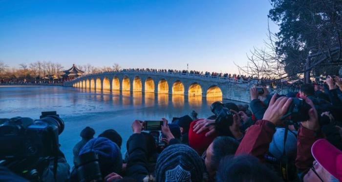 北京頤和園十七孔橋再現(xiàn)“金光穿孔”景象 (圖) 編輯人:荊書劍 發(fā)布時間:2017-12-12 12月10日下午,北京頤和園十七孔橋再現(xiàn)“金光穿孔”景象,上千名游客和攝影愛好者在南湖島拍攝這一冬日奇觀。每年冬至前后,頤和園十七孔橋的橋孔被夕陽照射,呈現(xiàn)出迷人的“金光穿孔”景象。 中新社