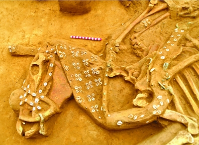 河北行唐故郡東周遺址車(chē)馬坑里用海貝裝飾的馬