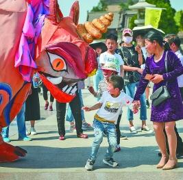 “五一”小長假期間,在陜西西安地標景點大雁塔南廣場上,每天14:30—19:00,都有7個高達3米的巨型人偶巡游。市民和游客爭相與它們合影互動,現場充滿歡聲笑語。