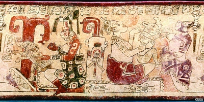 但在很多情況下,瑪雅人會(huì)將月神描繪為女性。波士頓美術(shù)館收藏的一件筒形杯上,彩繪有月亮女神給兔子哺乳的畫面。普林斯頓大學(xué)藝術(shù)博物館藏的一件著名繪畫筒形杯上則生動(dòng)描繪了月亮女神和兔子協(xié)助英雄雙兄弟智斗冥王的故事。據(jù)《波波烏》的記載,英雄雙兄弟被冥王殺死,但很快復(fù)活,裝扮成魔法師,表演火燒房屋和砍頭后復(fù)活等法術(shù),吸引冥王的注意,最后誘殺冥王,拯救了父親。但其中并沒(méi)有提及月亮女神的參與。