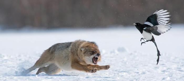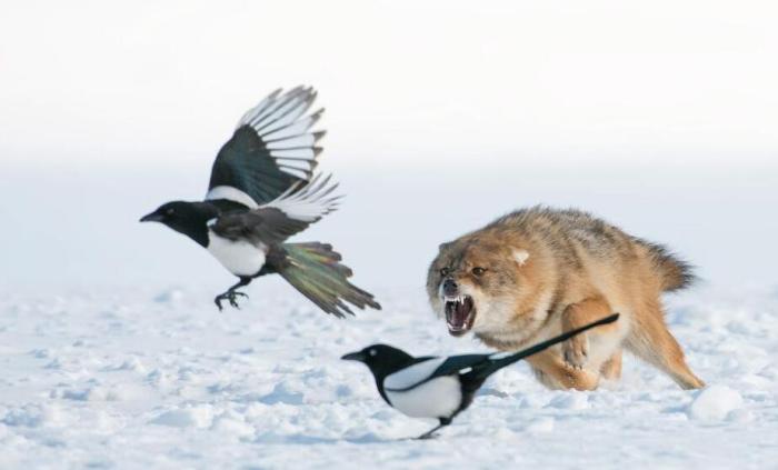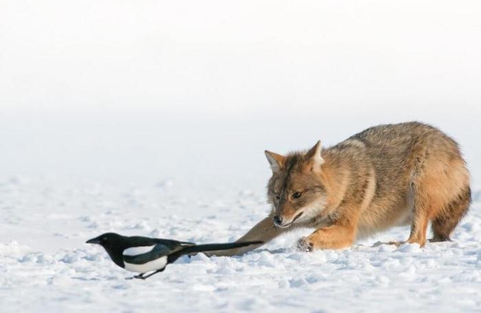野生胡狼雪地捕獵喜鵲 尖牙利齒目露兇光 (組圖)