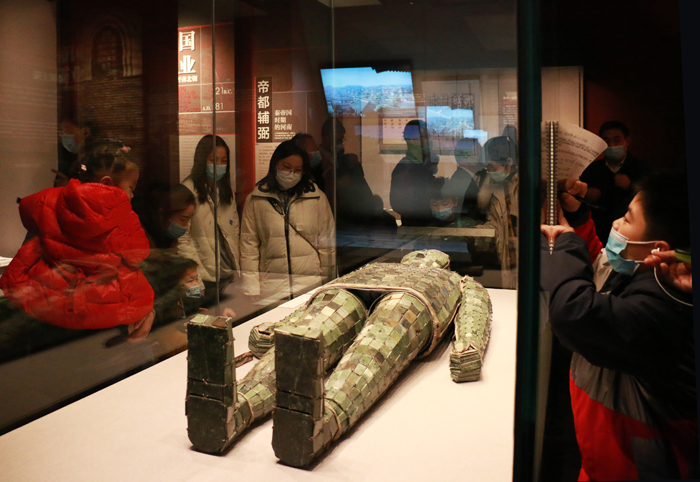 觀眾欣賞“泱泱華夏·擇中建都”基本陳列展出的金縷玉衣