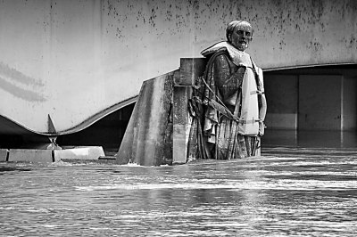2017年底巴黎人過了個暖冬。沒有凜冽寒風,唯有惱人的雨,總下個不停。雨悄無聲響,淅淅瀝瀝,不料一天竟喚醒了塞納河的春意,水暴漲了!開春以來,巴黎有名的阿爾瑪橋下的水位突破六米。2月3日經過橋邊的路人發現,橋墩上的石雕像“朱阿夫兵”(le Zouave)半身浸泡在水中,出人意料地穿上了橙色救生衣。
