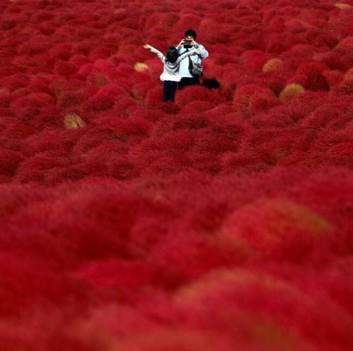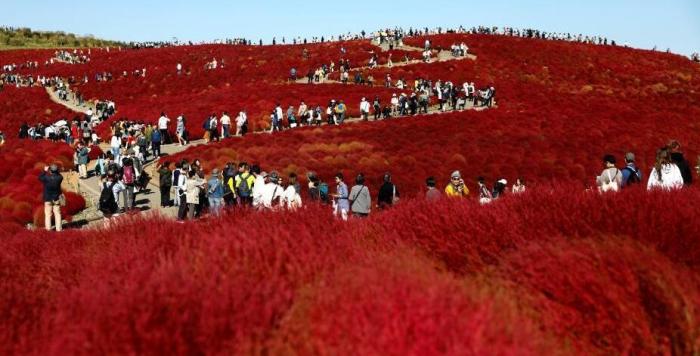 當地時間2018年10月22日,日本Hitachinaka,秋色漸濃,一大片火紅花海引游客徜徉其中。