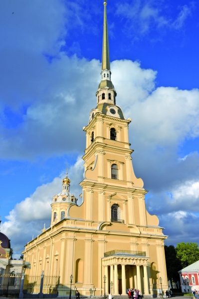 要塞內有一座圣彼得保羅大教堂。這是要塞中最著名也是最為耀眼的大教堂。建于1703年,原為木質建筑,1712年至1733年在原處改建為石頭教堂。大教堂的鐘樓高122米,金光閃閃的尖頂直聳云天,尖頂上是高達3.2米的天使塑像,天使塑像又是一個風向標。這個大教堂一直到20世紀中葉,都是圣彼得堡的最高建筑,是圣彼得堡古老的地標,也曾經是要塞的瞭望塔。現在,只有圣彼得堡的電視塔高度超過了教堂。在圣彼得堡的任何地方都能看到這個教堂的尖頂。大教堂于1919年關閉,1924年改為博物館。