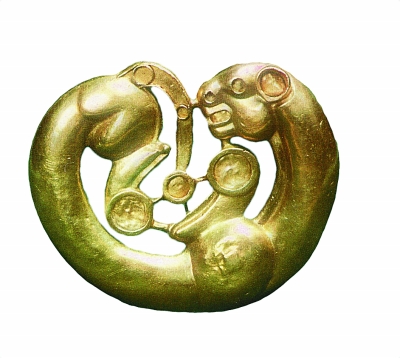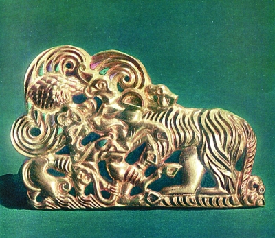 與此同時,少量文物也到了一些知識分子的手中。1664年,作為外交官的荷蘭科學家Н.К.維森(1641-1717)出使莫斯科,開始搜集有關西伯利亞歷史、地理的材料,其中不乏由挖墓人之手流入莫斯科的西伯利亞古物。特別是1714年和1717年,維森總共獲得了將近40件帶有野獸紋的黃金飾品,這些藝術品連同伊爾比特巖畫(位于斯維爾德洛夫斯克地區)的線圖,于1785年出現在了其名著《北方和東方的韃靼》一書的第三版中。