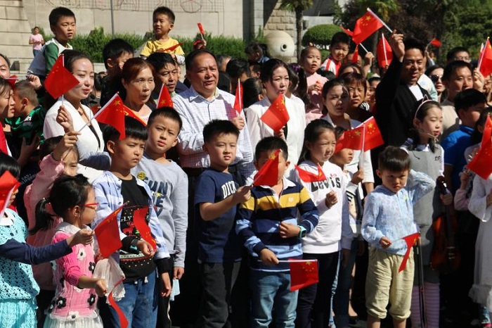 隨著伴奏音樂的響起,華夏古樂團團長、河南省著名青年男高音歌唱家霍錕領唱《我愛你,中國》,大家面向國旗激情澎湃,廣場瞬時變為國旗的海洋、歌聲的海洋。
