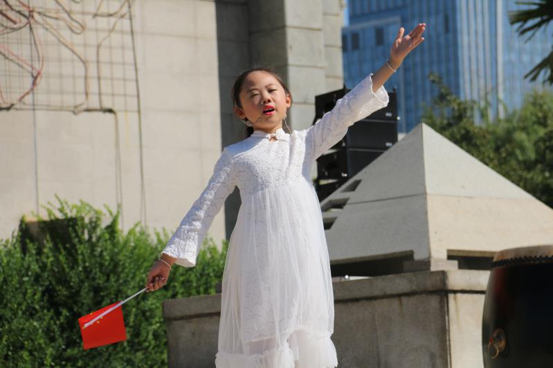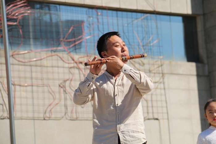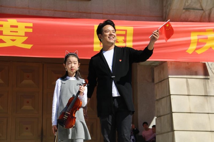 鼓聲戛然,兩個身著白紗裙的小女孩緩步走上臺階,小提琴和童聲相繼送出《我愛你,中國》那親切而熟悉的旋律,華夏古樂團青年笛簫演奏家賀小帥從人群中走出,嘹亮的笛聲將旋律延續向更遠的地方。