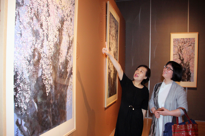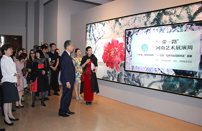 與會嘉賓觀看呂娟女士在“一帶一路”河南藝術(shù)周上的《牡丹與櫻花的對話》畫展