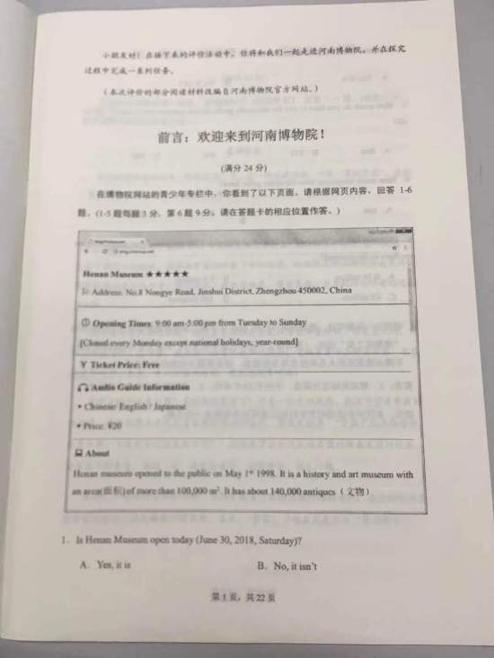 河南博物院17萬件的館藏文物,尤以夏商周時期的青銅器為最,但其大量的陶樓依然是不可小覷的部分。以院網站“每周一品”欄目品讀的“彩繪陶院落”為藍本而精心設計的英語說明文章,在整張卷子中占了不少的分值,考量著小學畢業生們對于方位、詞匯等方面的知識儲備情況。