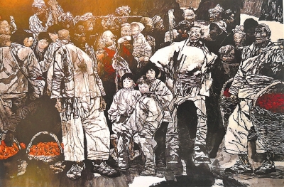 你看那《太行人》《壓酸菜》《日出》《華山挑夫》等作品,他用濃重粗獷的筆觸,強烈對比的視覺效果,雕刻出一個個憨厚樸實,飽含滄桑與悲壯感的人物形象;用一片片酣暢的墨韻,一根根澀滯的線條,牽縈著他刻骨銘心的“太行情結”。他贊美的是民族風骨,他塑造的是民族脊梁。
