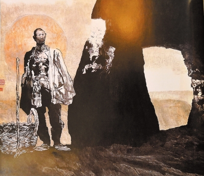 在繼承傳統水墨技法和筆墨語言的基礎上,他執著探索,勇于創新,把雕塑、版畫、油畫的技法融入中國畫,把五彩世界融入水墨天地,把立體的三維景象“化”入平面的二維世界,從而拓展出中國水墨人物畫的新境界?!蹲叱霭皖伩窉昝摿藗鹘y筆墨的束縛,將西方造型與東方意象融合在一起,其蓬勃的生命形態,磅礴的畫風,使得作品熠熠生輝,帶給人強烈的震撼。