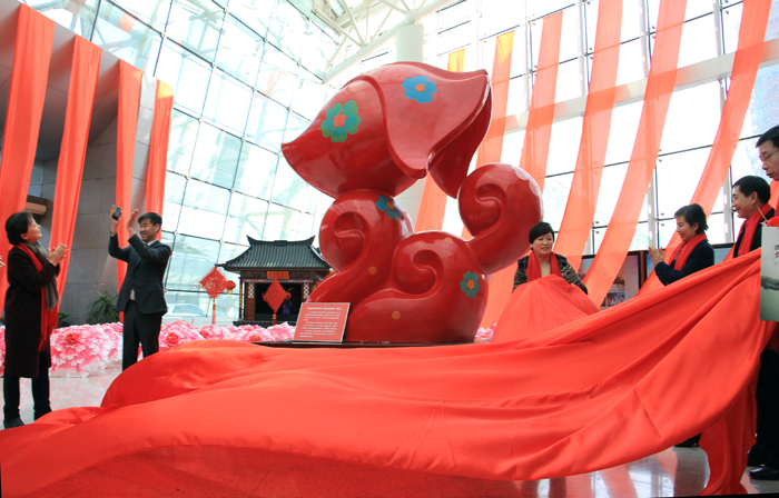 黃河科技學(xué)院教授楊慶平已連續(xù)十年創(chuàng)作新年生肖吉祥物,他今年設(shè)計(jì)的吉祥物《旺年有余》同往年的吉祥物主打色相同,依然是傳統(tǒng)喜慶的中國紅。造型上運(yùn)用時(shí)尚的裝飾風(fēng)格,流暢優(yōu)雅的線條,充滿韻律的動態(tài),整體簡單概括,設(shè)計(jì)感強(qiáng),吉祥物雕塑具有四大創(chuàng)意設(shè)計(jì):1、形式上采用概括夸張的裝飾手法,突出了既有狗的輪廓又有魚水吉祥之意,輪廓線具有簡潔流暢之美。2、色彩上夸張、強(qiáng)烈。大紅色的基色,熱烈,激情、吉祥,配以各色花朵,裝飾味十足比喻我們的生活豐富多彩。3、造型設(shè)計(jì)巧妙,充滿吉祥元素。遠(yuǎn)看是活潑的小狗,近看有魚,有水,有祥云。設(shè)計(jì)突破了傳統(tǒng)造型,大膽創(chuàng)新,三朵浪花(也是祥云,還是三個數(shù)字9)組成了小狗的身體,一條金魚躍然浪尖,卻是小狗頭部造型。吉祥物設(shè)計(jì)蘊(yùn)含著美好的寓意,旺年有余,魚躍龍門,旺運(yùn)連連,好運(yùn)吉祥,紅紅火火,花開富貴,旺財(cái)旺業(yè)。4、吉祥物雕塑尺度設(shè)計(jì),總高365厘米,預(yù)示一年365日個好運(yùn)、吉祥送給大家。 吉祥物設(shè)計(jì)結(jié)合了傳統(tǒng)與時(shí)尚、現(xiàn)實(shí)與想像、唯美與理想元素,看上去可愛活潑,惹人喜愛。
